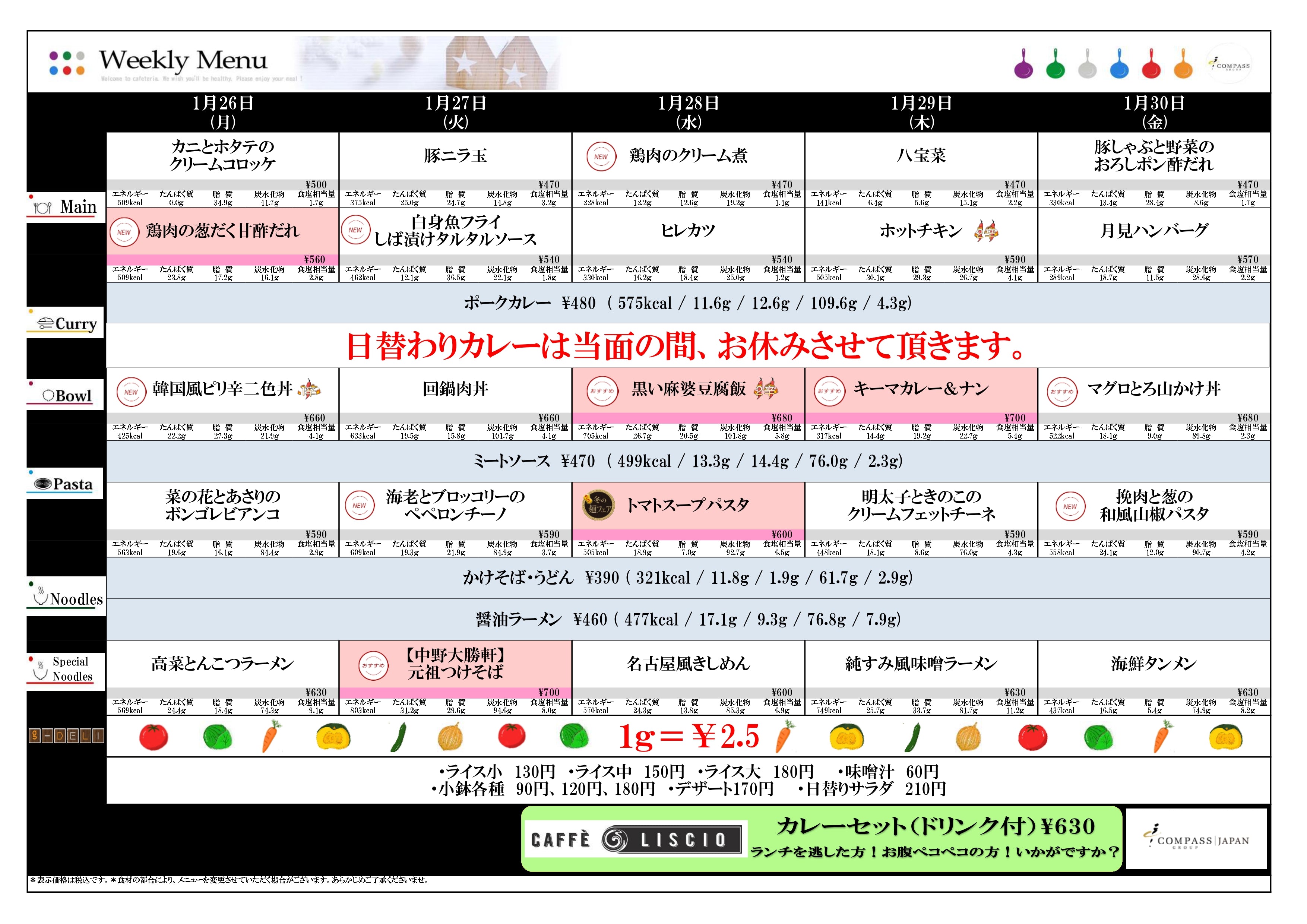 2026年01月26日(月) 〜 2026年01月30日(金) のメニュー